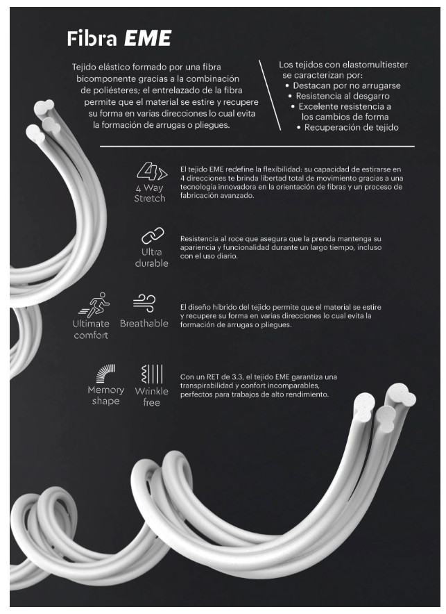 Corte slim fit. Elástico alto rendimiento. Composición: 100% EME. Gramaje: 280 gr/m²