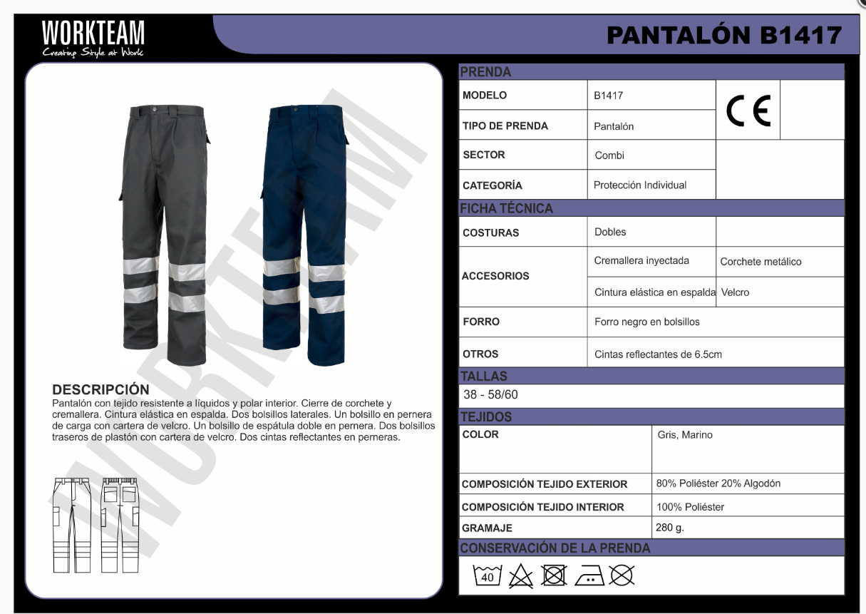 Multibolsillos con tejido polar interior. Dos cintas reflectantes. Composición: 80% poliéster 20% algodón. Gramaje: 280 gr/m²